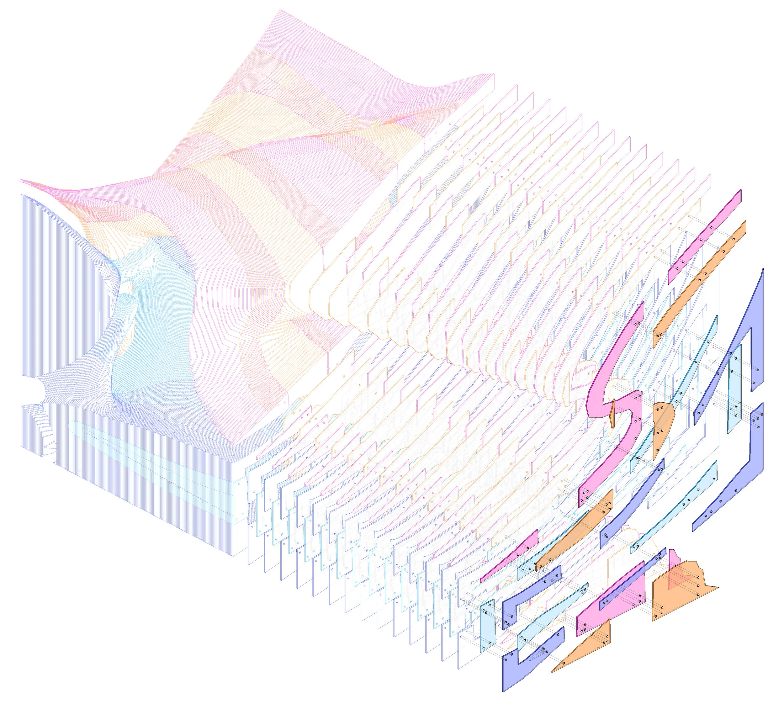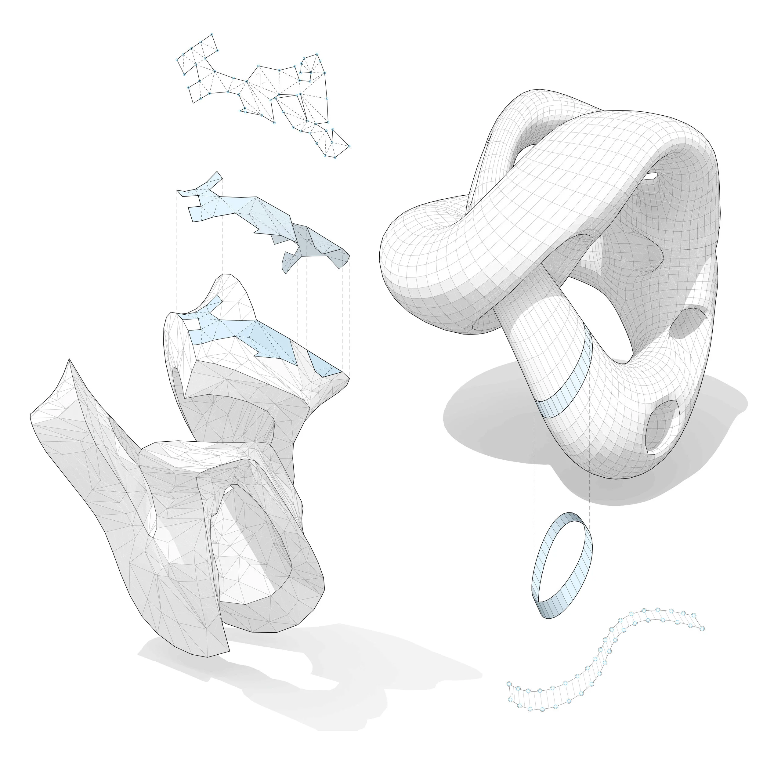 The object was stacked vertically so that each contour was non-continuous to create porosity. The overlap generated a graphic pattern that undulated, developed in a way to explore the variation in porosity. The contours of the mass are at alternative intervals of the offset of the surface and base elements to allow the contoured planes to slide through the voids of each other as they intersect and move through each other.
